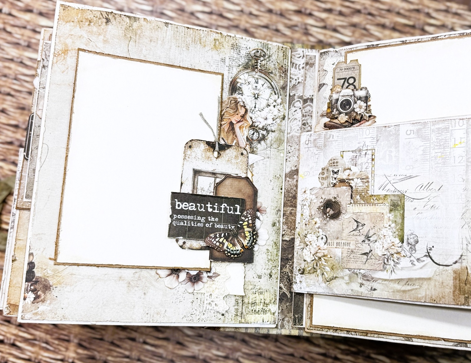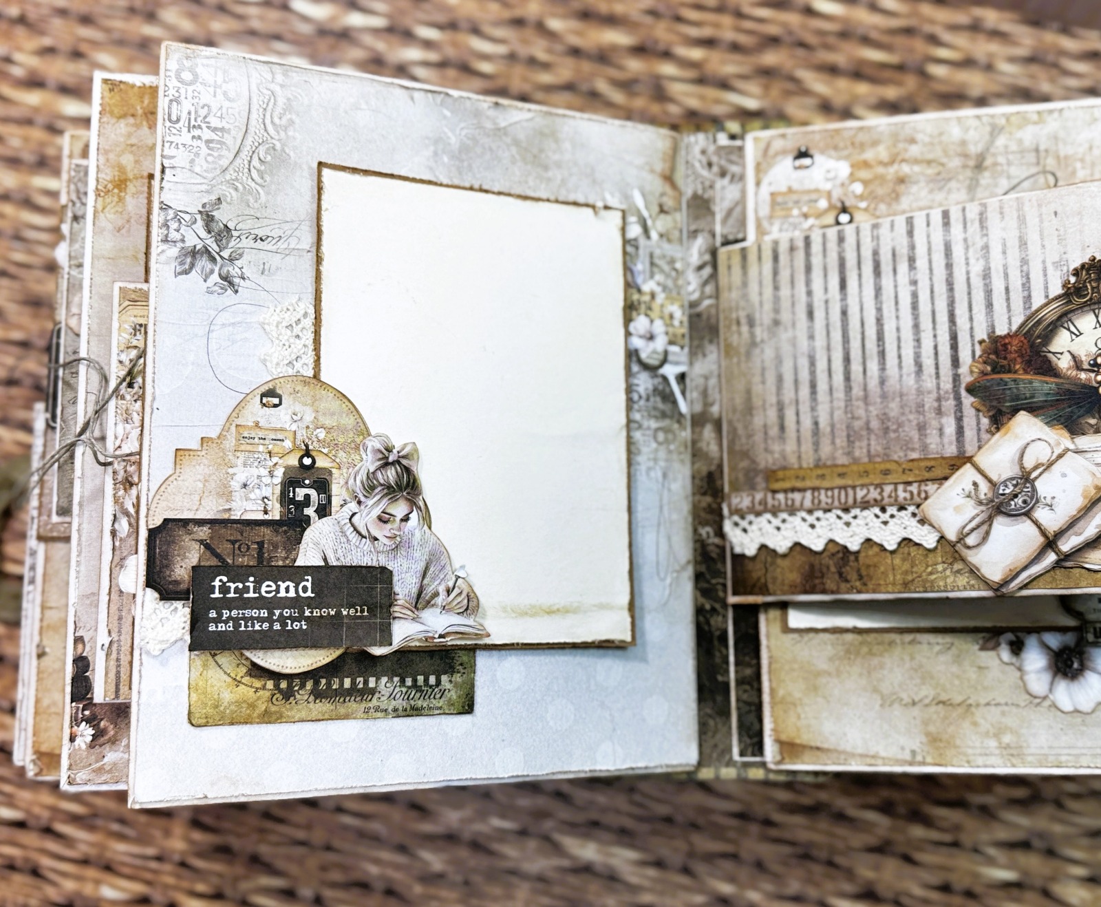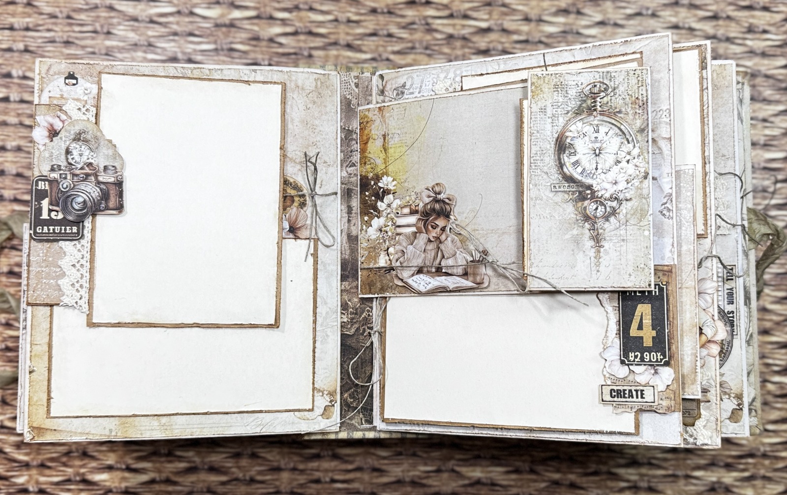 Nasz album powstanie z 8 kopert w trzech różnych rozmiarach, a całość obłożymy specjalnie zaprojektowaną okładką od Alchemy of Art. Do dekoracji użyjemy dwóch kolekcji papierów w rozmiarze 20 x 20 cm oraz aż dwóch bloczków dodatków, dzięki którym stworzymy bogate i efektowne kompozycje. Klimatu dodadzą sznurek, koronka oraz piękna wstążeczka vintage.