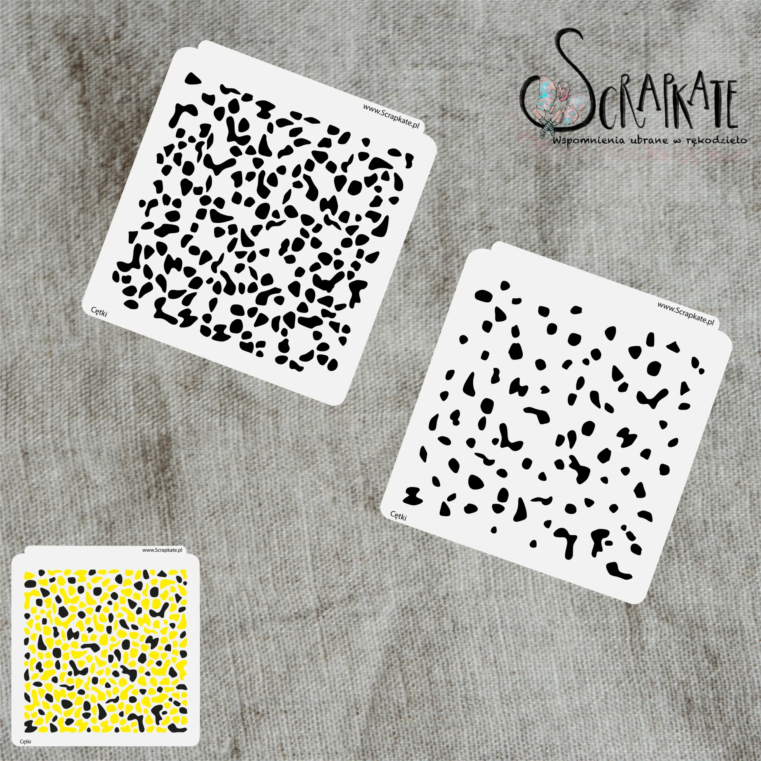 Maska CĘTKI to niezwykle uniwersalny wzór, inspirowany delikatnym, nieregularnym układem plamek przypominających gepardzie umaszczenie. Idealnie sprawdzi się jako tło do prac mixed-media, kartkowych czy albumowych, dodając projektom charakteru i subtelnej struktury.